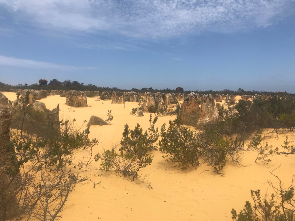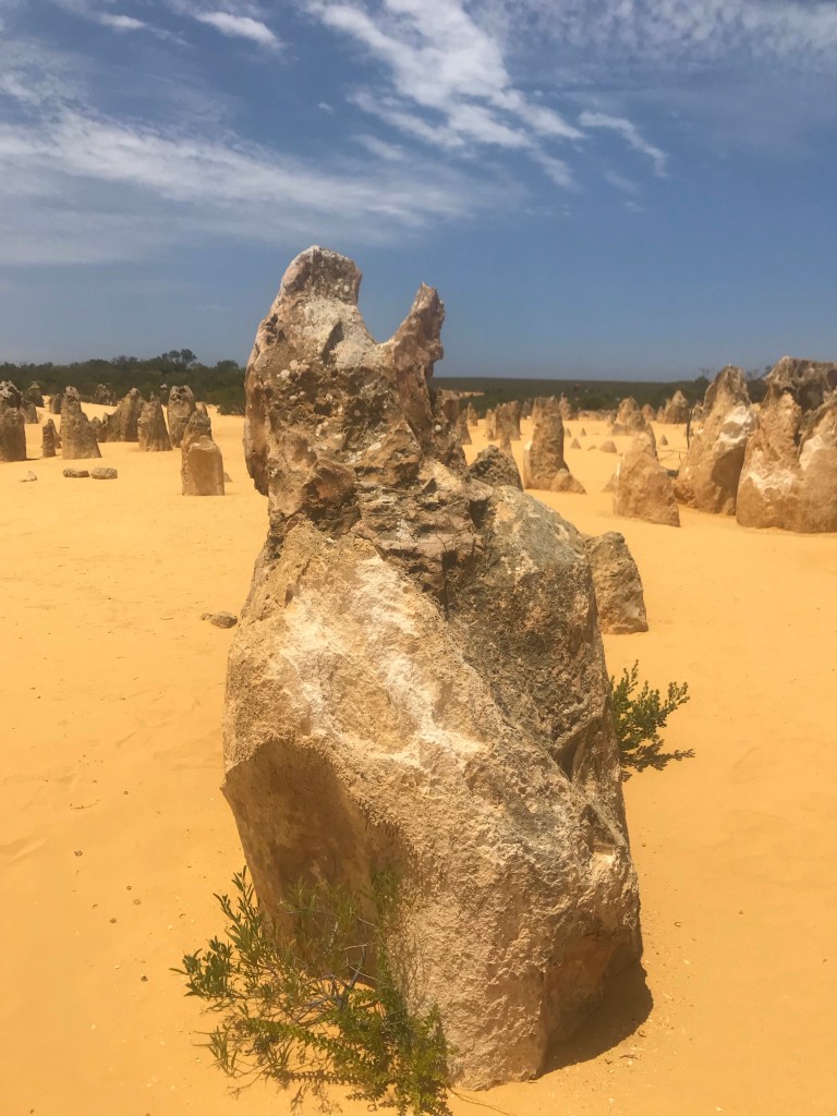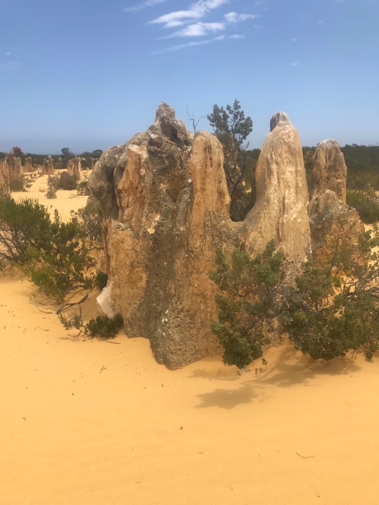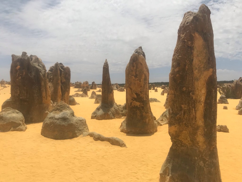 Heute waren wir bei den Pinnacles im Nambung National Park. Diese seltsamen Steingebilde haben sich unter den Dünen durch Saures Grundwasser gebildet und wurden dort auf einer großen Fläche durch das Wandern der Dünen freigelegt. Wind, Sand und Regen tun ihr Übriges und gestalten die „Skulpturen“ weiter aus. Aber seht selbst